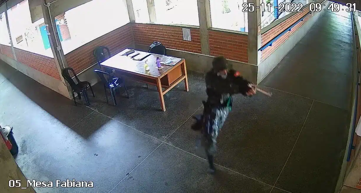 Na sequência, o atirador foi para o Centro Educacional Praia de Coqueiral, onde atirou em outras três pessoas, sendo que uma morreu no local. Nas imagens da escola, é possível ver o criminoso usando roupa camuflada, máscara e portando uma arma que parecia ser uma submetralhadora.