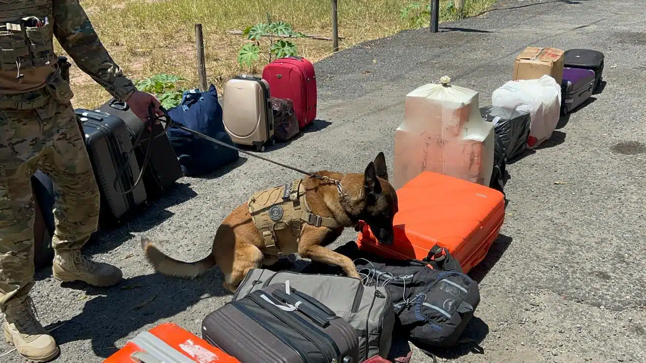 O veículo em que a mulher estava foi parado e o cães fizeram a revista das bagagens de todos os passageiros. Em determinado momento, os animais sinalizaram que uma mala laranja e uma mochila preta poderiam conter os entorpecentes.