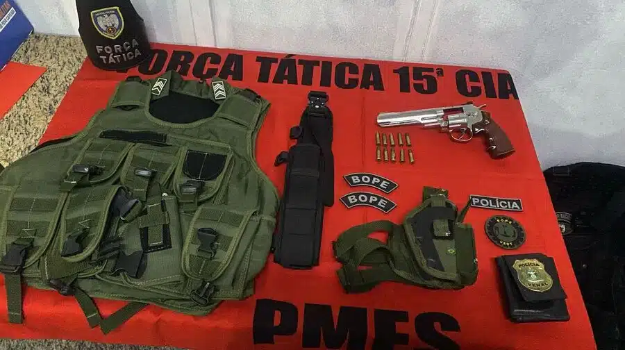 Nas buscas, os militares encontram a arma que ele portava, verificando-se tratar de um simulacro de revólver. Também foram encontrados vários acessórios militares como uma capa de colete tático, distintivo da Polícia Penal e munições de propulsão. O homem foi conduzido à 7ª Delegacia Regional de Cachoeiro de Itapemirim.