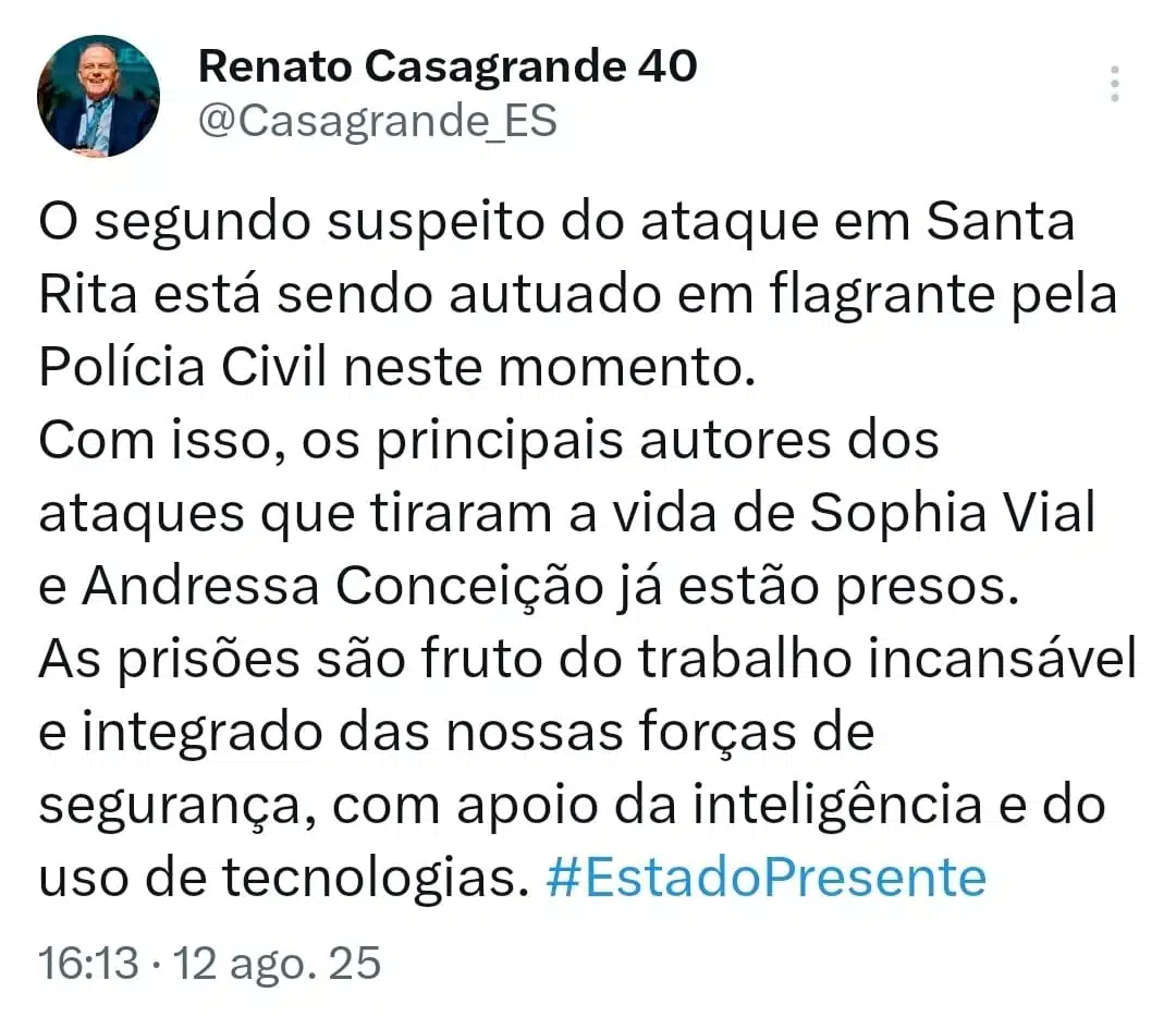 A prisão foi anunciada pelo governador Renato Casagrande por meio das redes sociais.