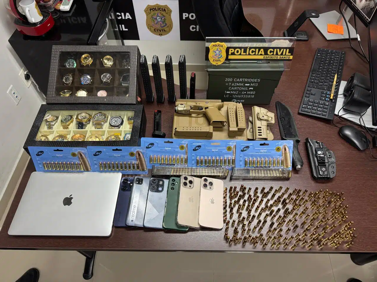 Durante o cumprimento do mandado de busca contra o líder do esquema, na casa dele em Vale Encantado, Vila Velha, foram apreendidos relógios, celulares, documentos, uma pistola 9mm, oito carregadores, 314 munições, além de armas de airsoft, como pistolas e rifles. Contas bancárias dos investigados foram bloqueadas.