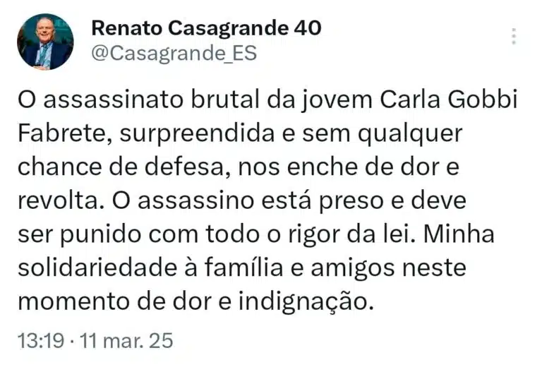 O governador do Espírito Santo, Renato Casagrande, se manifestou sobre o assassinato da vendedora Carla Gobbi Fabrete, de 25 anos, esfaqueada dentro de uma loja no bairro da Glória, em Vila Velha, na tarde de segunda-feira (10). Em uma publicação na rede social X, ele expressou pesar e cobrou punição rigorosa para o autor do crime.