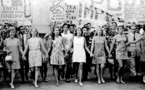 Foto histórica, com Leila Diniz, com mulheres protestando contra a censura imposta pelo AI-5.