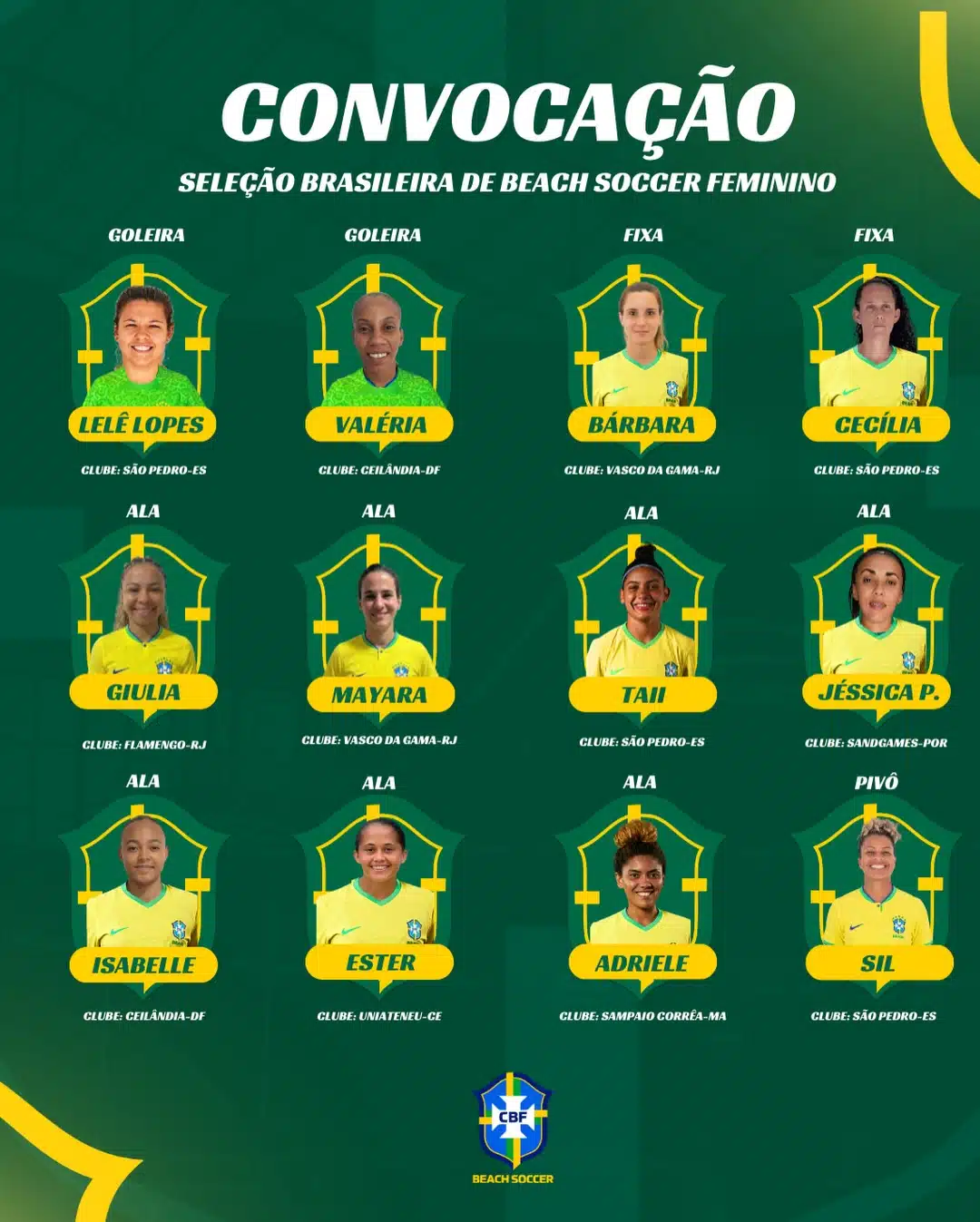 As atletas do Espírito Santo convocadas são do São Pedro, o mais tradicional time do beach soccer capixaba. A equipe capixaba ocupa o primeiro lugar no ranking mundial de clubes na categoria feminina.