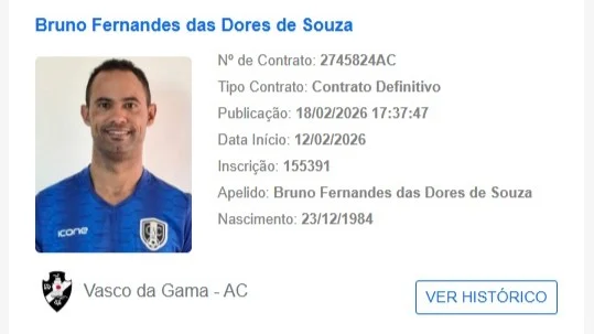 O Vasco do Acre registrou nesta quarta-feira (18) o contrato do goleiro Bruno Fernandes no Boletim Informativo Diário (BID) da Confederação Brasileira de Futebol (CBF). Com a regularização publicada, o jogador está apto a estrear pela equipe acreana nesta quinta-feira (19), contra o Velo Clube-SP, pela primeira fase da Copa do Brasil.
