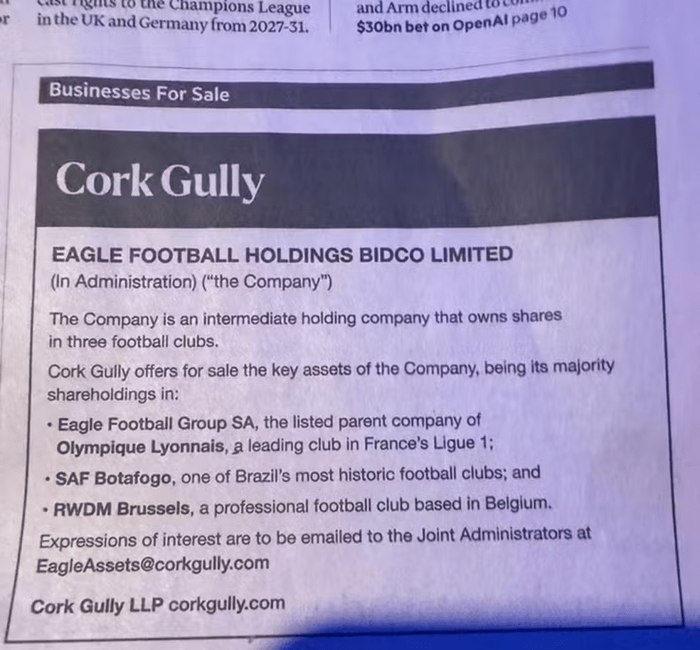 A publicação do anúncio detalha que a Cork Gully atua como administradora da Eagle Football Holdings Bidco Limited, empresa intermediária responsável por controlar as ações desses clubes. Veja o anúncio: