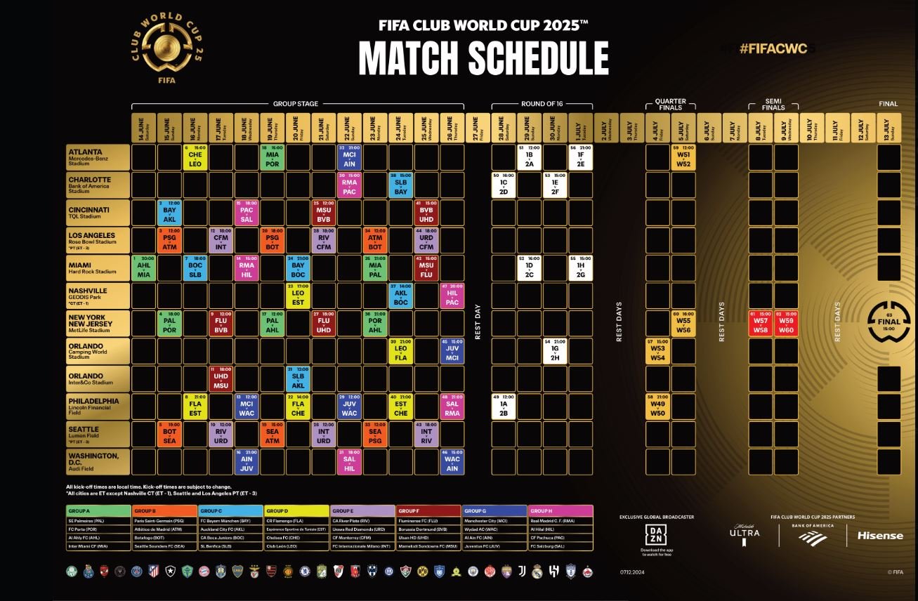 A Fifa (Federação Internacional de Futebol) anunciou neste sábado (7) a tabela completa da primeira fase do Mundial de Clubes de 2025, competição que será disputado nos Estados Unidos entre os dias 14 de junho e 13 de julho. E a primeira equipe do Brasil a entrar em ação no torneio será o Palmeiras, que medirá forças com o Porto (Portugal) a partir das 19h (horário de Brasília) de 15 de junho no MetLife Stadium, em Nova Jersey.