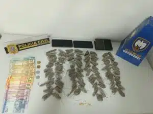 Foram apreendidos 16 pedras de crack; 90 tiras de maconha; 01 caderno de anotação do tráfico e dois aparelhos telefônicos.  Os detidos foram encaminhados à Delegacia de Vila Valério.