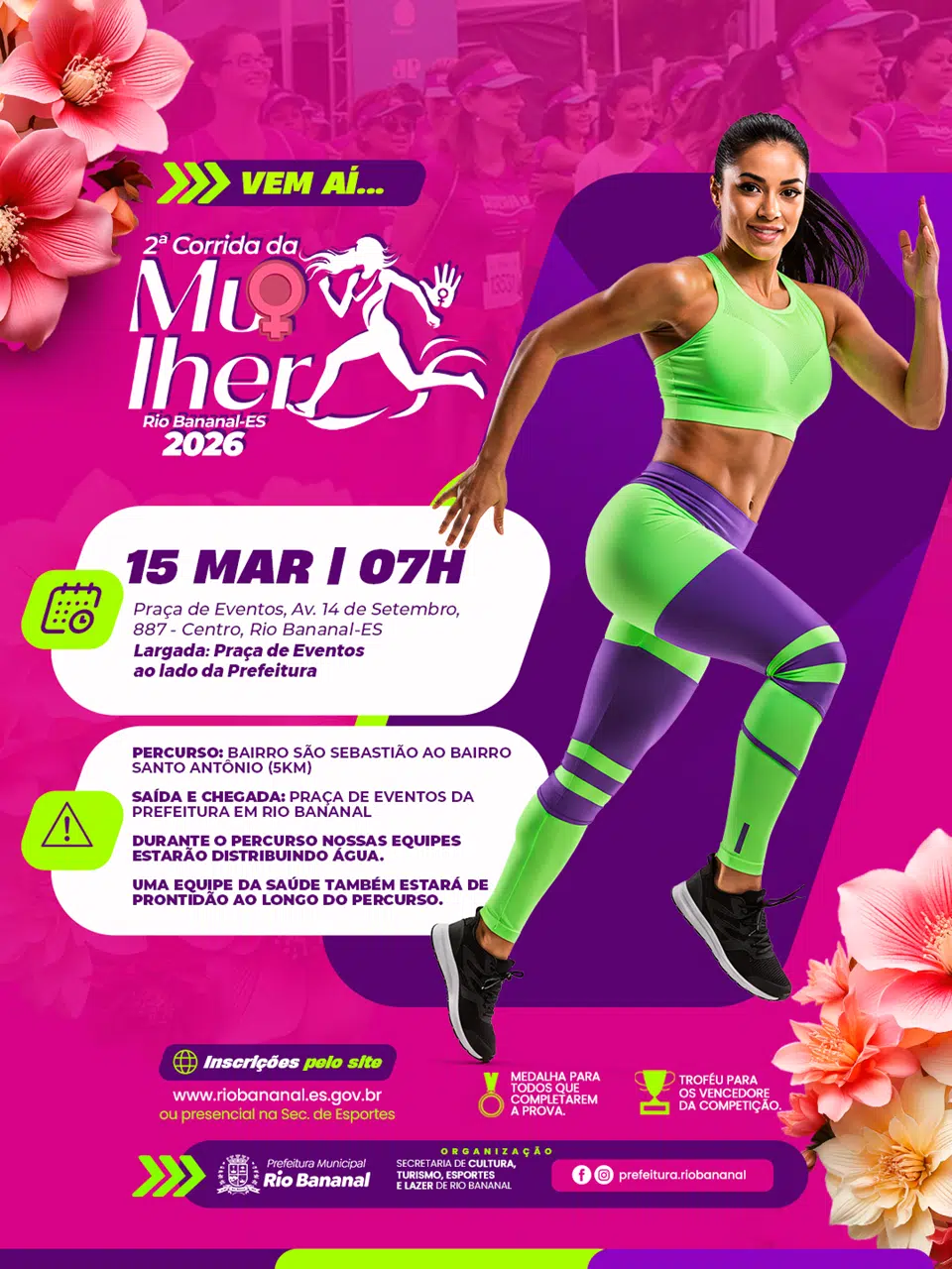 A Prefeitura de Rio Bananal promove, no dia 15 de março de 2026, a 2ª edição da Corrida da Mulher. O evento esportivo será realizado a partir das 7h, com largada na Praça de Eventos do município.
