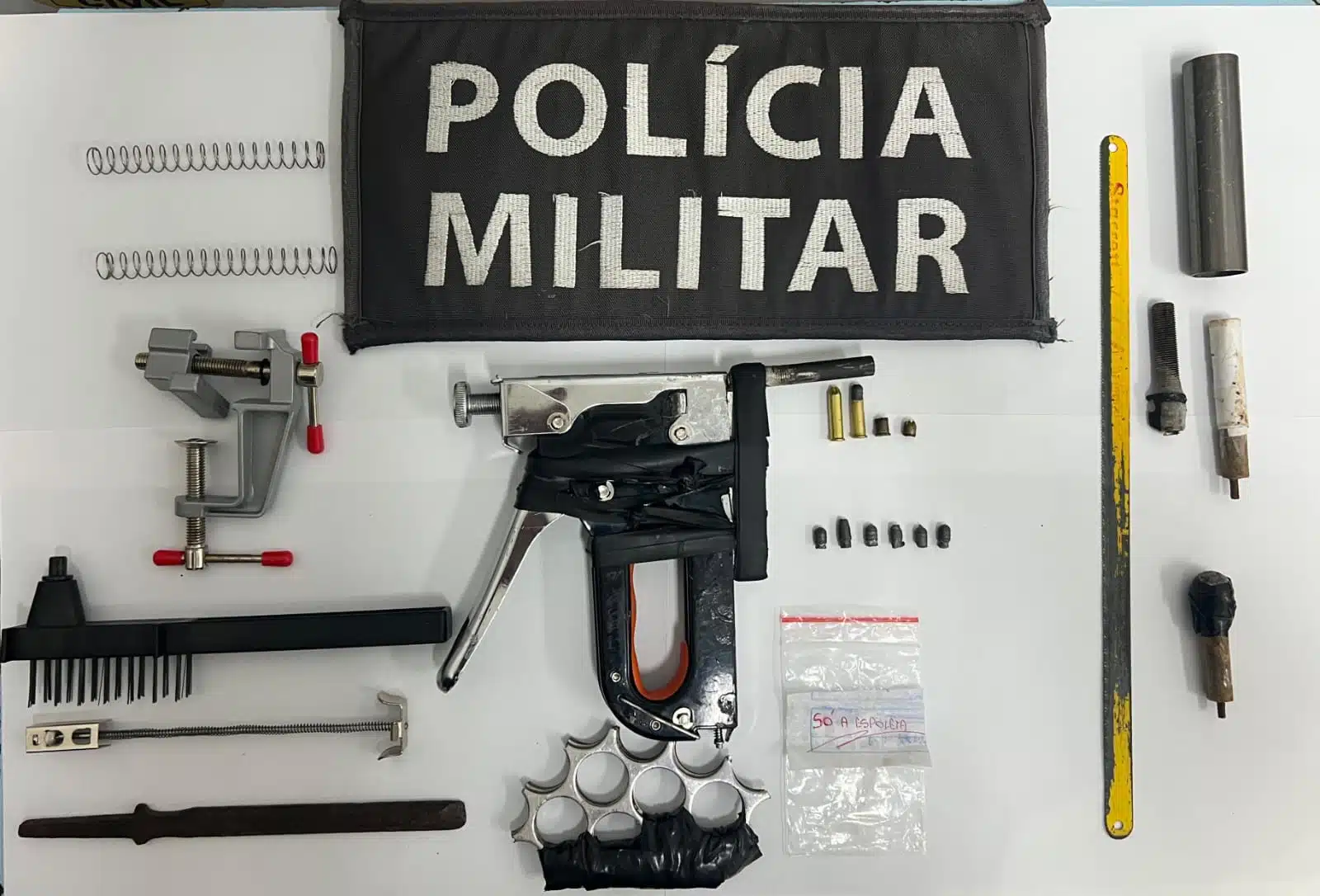 De acordo com a Polícia Militar, ao chegarem ao local indicado, os agentes localizaram o menor, que prontamente entregou os materiais ilícitos. Durante a ação, foram apreendidos uma arma de fogo de fabricação caseira, uma munição calibre .22 intacta, um soco inglês, além de ferramentas e insumos utilizados para a fabricação de armas e munições.