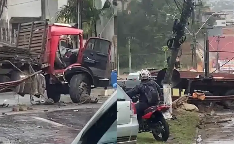 Um caminhão ficou atravessado na pista após bater contra um poste na BR-482, na chegada do bairro Paraíso, em Cachoeiro de Itapemirim, no Sul do Espírito Santo, na manhã desta quinta-feira (23).