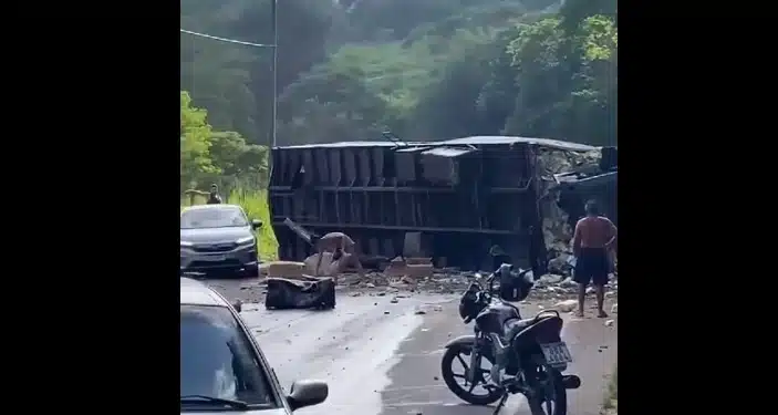 Uma carreta com placa de São Paulo, carregada com carnes, tombou na manhã desta sexta-feira (24) na Rodovia ES 164 que liga Cachoeiro de Itapemirim a Vargem Alta. O motorista, identificado como Josué da Silva Gomes, de 53 anos, teria perdido o controle da direção do veículo, causando o tombamento. A carga transportada foi saqueada por populares, antes da chegada da polícia.