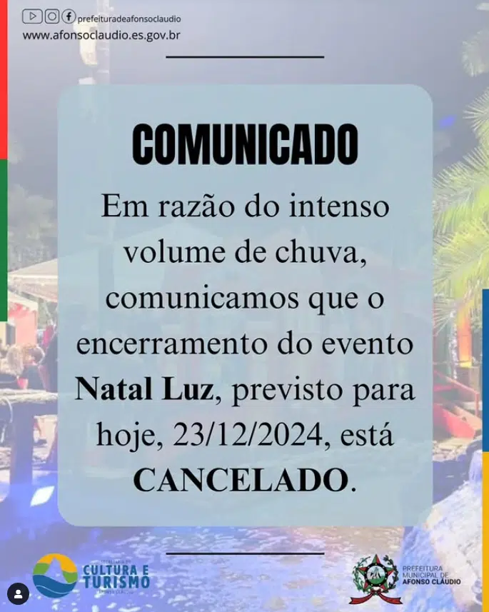 Por conta das chuvas e dos estragos causados na cidade, o encerramento do evento Natal Luz, previsto para essa segunda-feira (23), foi cancelado. Em nota divulgada nas redes sociais a prefeitura alerta que o município ainda está sob alerta de chuvas intensas e pede que moradores, principalmente os das zonas rurais, que fiquem atentos às condições das estradas e pontes atingidas.