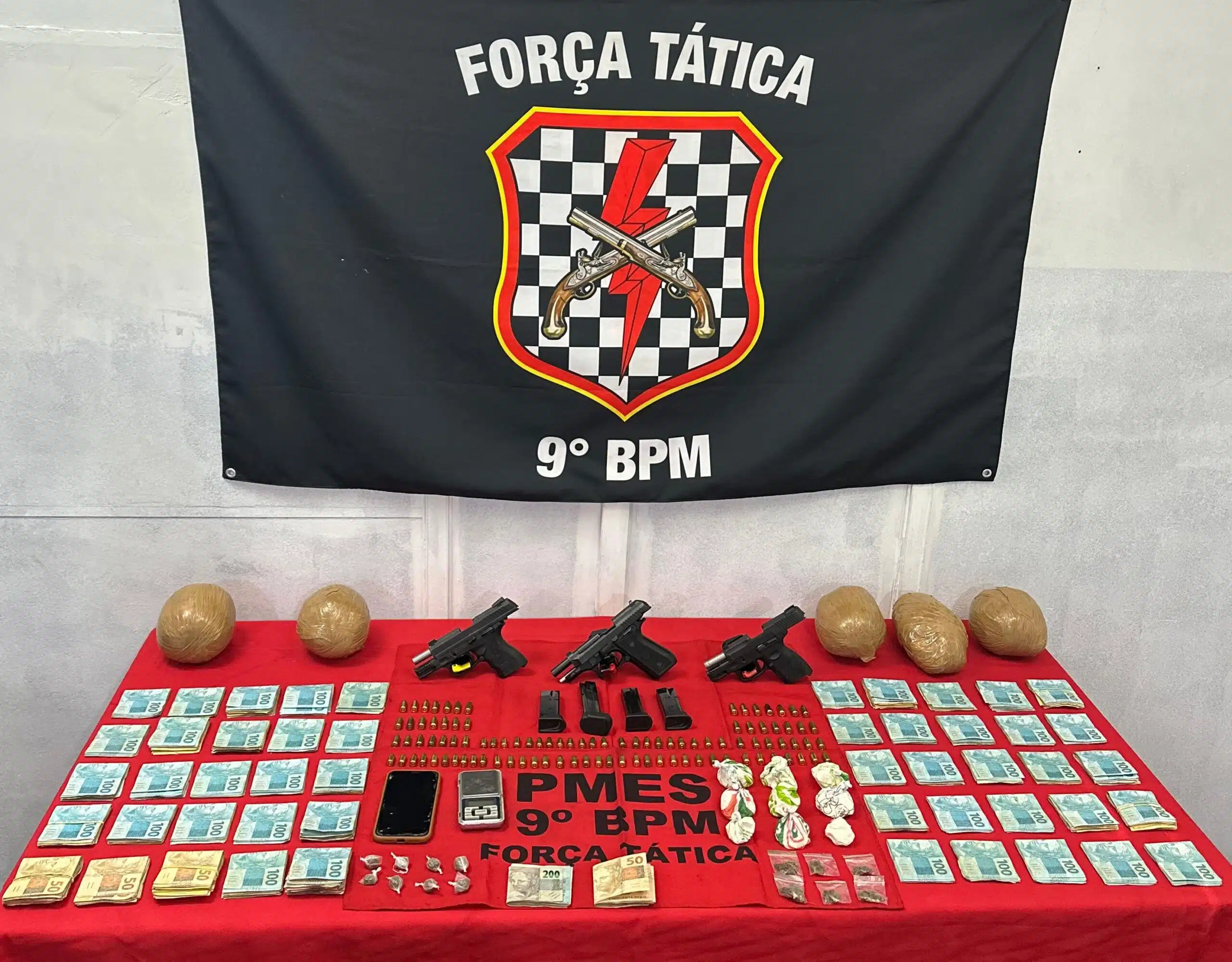 Na noite desta quinta-feira (17), a Polícia Militar, por meio da Força Tática do 9º Batalhão, apreendeu uma quantidade significativa de drogas, armas e uma quantia superior a R$50 mil em Cachoeiro de Itapemirim. Um homem de 42 anos foi detido durante a operação.