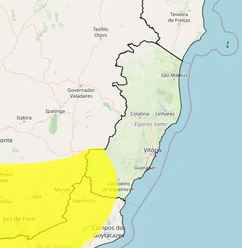 O Instituto Nacional de Meteorologia (Inmet) emitiu um alerta amarelo – de perigo potencial – para chuvas intensas, que abrange 20 municípios do Espírito Santo.