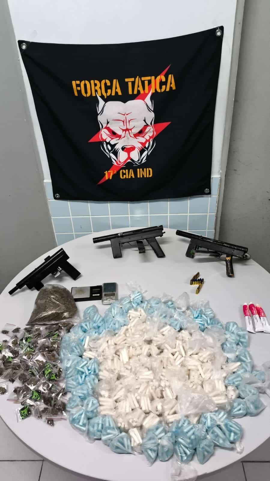 O homem conseguiu fugir, mas, durante buscas no imóvel, os policiais localizaram 1.468 pinos de cocaína, 115 buchas de skunk, diversos materiais para embalo e três submetralhadoras caseiras calibre 9mm com 17 munições no total. As buscas também resultaram na apreensão de uma balança de precisão, um liquidificador, um pote plástico, uma colher e tubos de lidocaína, produtos comumente utilizados para o preparo de entorpecentes.