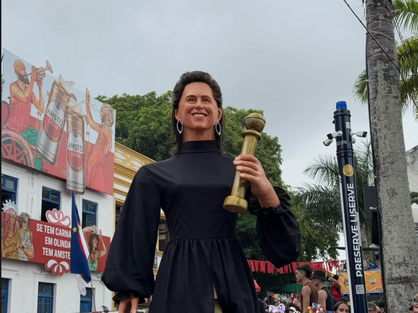 A presença de bonecos gigantes é uma das marcas do carnaval de Olinda, que todos os anos homenageia figuras icônicas da cultura brasileira. O modelo escolhido para homenagear Torres remeteu a sua roupa e seu prêmio de Melhor Atriz de Drama no Globo de Ouro deste ano, por Ainda Estou Aqui, filme vencedor do primeiro Oscar brasileiro.