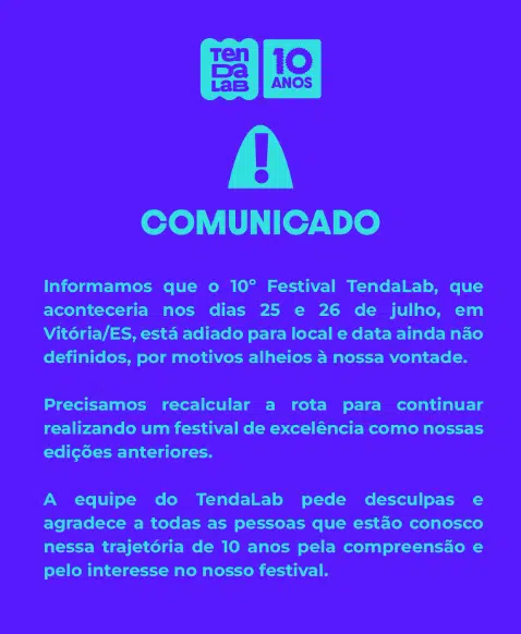 “Precisamos recalcular a rota para continuar realizando um festival de excelência como nossas edições anteriores”, diz a nota assinada pela equipe do TendaLab, que também agradeceu pela compreensão e pelo apoio de quem acompanha o projeto ao longo da última década.