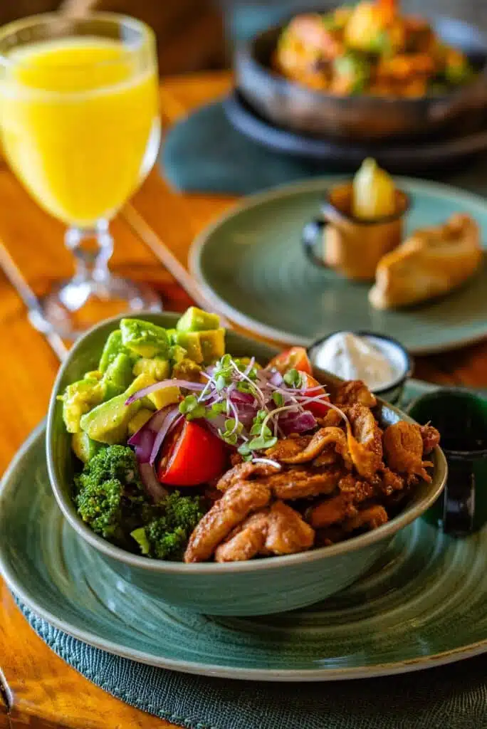 Almoço: Salada mesclada de folhas ou clássica Caesar com toque do chef (entrada); prime cowboy steak, filé de tilápia especial ou peito de frango com creme de milho (prato principal); cookies & cream ou petit gâteau (sobremesa).
