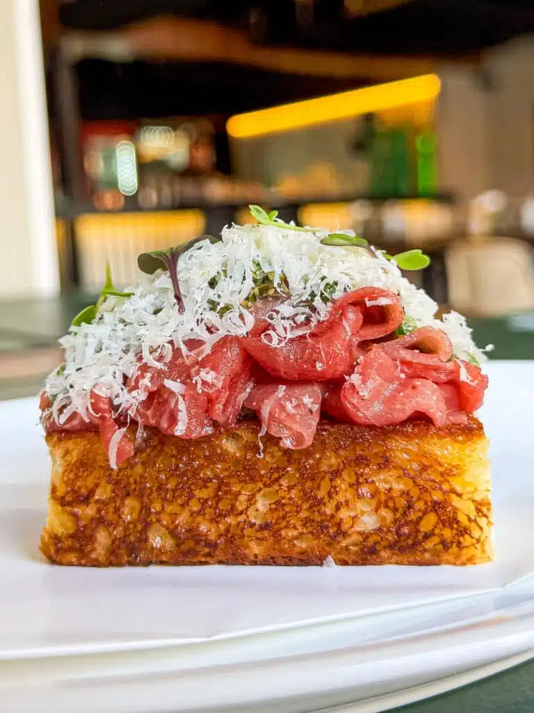 Jantar: “Kafta de fraldinha, coalhada caseira e molho gremolata ou tiradito de bife de chorizo angus, molho ponzu e maionese especial (entrada); bife de vazio na brasa, mil folhas de batata e creme de parmesão ou cupim ao disco de arado com pappardelle ao molho de tomate pelatti (prato principal); crocante de amêndoas, creme de ristretto e doce de leite ou abacaxi na brasa, creme diplomata e hortelã (sobremesa).