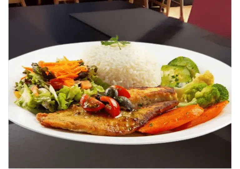 Almoço: Carpaccio de salmão com cebola roxa, coentro e molho de limão siciliano (entrada) ou Salada Caesar – Mix de folhas, frango desfiado, croutons, parmesão ralado (entrada); Tilápia grelhada na manteiga de alcaparras com purê de banana da terra e farofa de siciliano (principal) ou File mignon grelhado ao molho chimichurri e risoto de alho poro com cubos de bacon (principal); Torta de maracujá com ganache de chocolate meio amargo (sobremesa) ou Torta de abacaxi com coco (sobremesa).