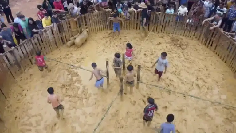 Quem topa o desafio entra descalço na arena, encara a lama e tenta agarrar o animal. As rodadas são feitas com três participantes por vez, com tempo contado. Quem consegue pegar, leva o porco. Quem não consegue pode tentar de novo, pagando uma taxa.