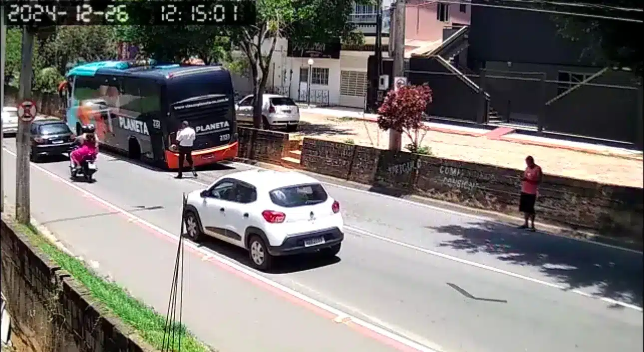 Uma câmera de videomonitoramento flagrou o momento em que a roda de um ônibus se desprendeu do veículo em movimento na Rodovia Gumercindo Moura Nunes (Linha Vermelha), na tarde desta quinta-feira (26), em Cachoeiro de Itapemirim, no Sul do Espírito Santo.