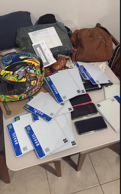 Durante os cumprimentos dos mandados foram apreendidos diversos celulares e aparelhos eletrônicos, equipamentos para adulterar as placas virgens, um veículo Toyota Corola, três motocicletas e diversas placas de veículos ainda virgens.
