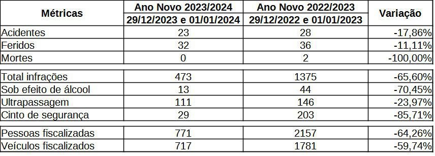 A Operação Ano Novo da Polícia Rodoviária Federal, encerrada às 23h59 de segunda-feira (1°), registrou uma redução no número de ocorrências e queda da gravidade dos acidentes durante o feriado nas rodovias federais do Espírito Santo. No período houve 23 acidentes que resultaram em 32 feridos, sem nenhum óbito. Segundo o levantamento da PRF, divulgado nesta terça-feira (2), os flagrantes de ultrapassagens em locais proibidos, que passaram de 100, seguem frequentes no Estado.