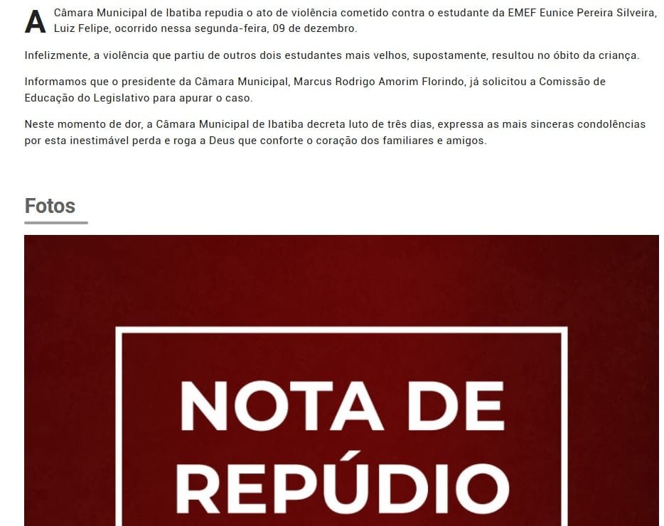 Diz a nota: “A Câmara Municipal de Ibatiba repudia o ato de violência cometido contra o estudante ocorrido na segunda-feira, 9 de dezembro. Infelizmente, a violência que partiu de outros dois estudantes mais velhos, supostamente, resultou no óbito da criança. Informamos que o presidente da Câmara Municipal, Marcus Rodrigo Amorim Florindo, já solicitou a Comissão de Educação do Legislativo para apurar o caso. Neste momento de dor, a Câmara Municipal de Ibatiba decreta luto de três dias, expressa as mais sinceras condolências por esta inestimável perda e roga a Deus que conforte o coração dos familiares e amigos”.