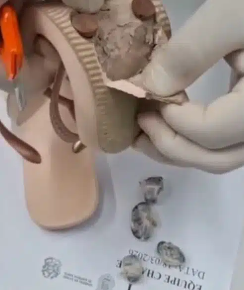 Um vídeo que circula nas redes sociais mostra exatamente o momento em que a droga é retirada de dentro do calçado, revelando como o material estava escondido de forma improvisada.