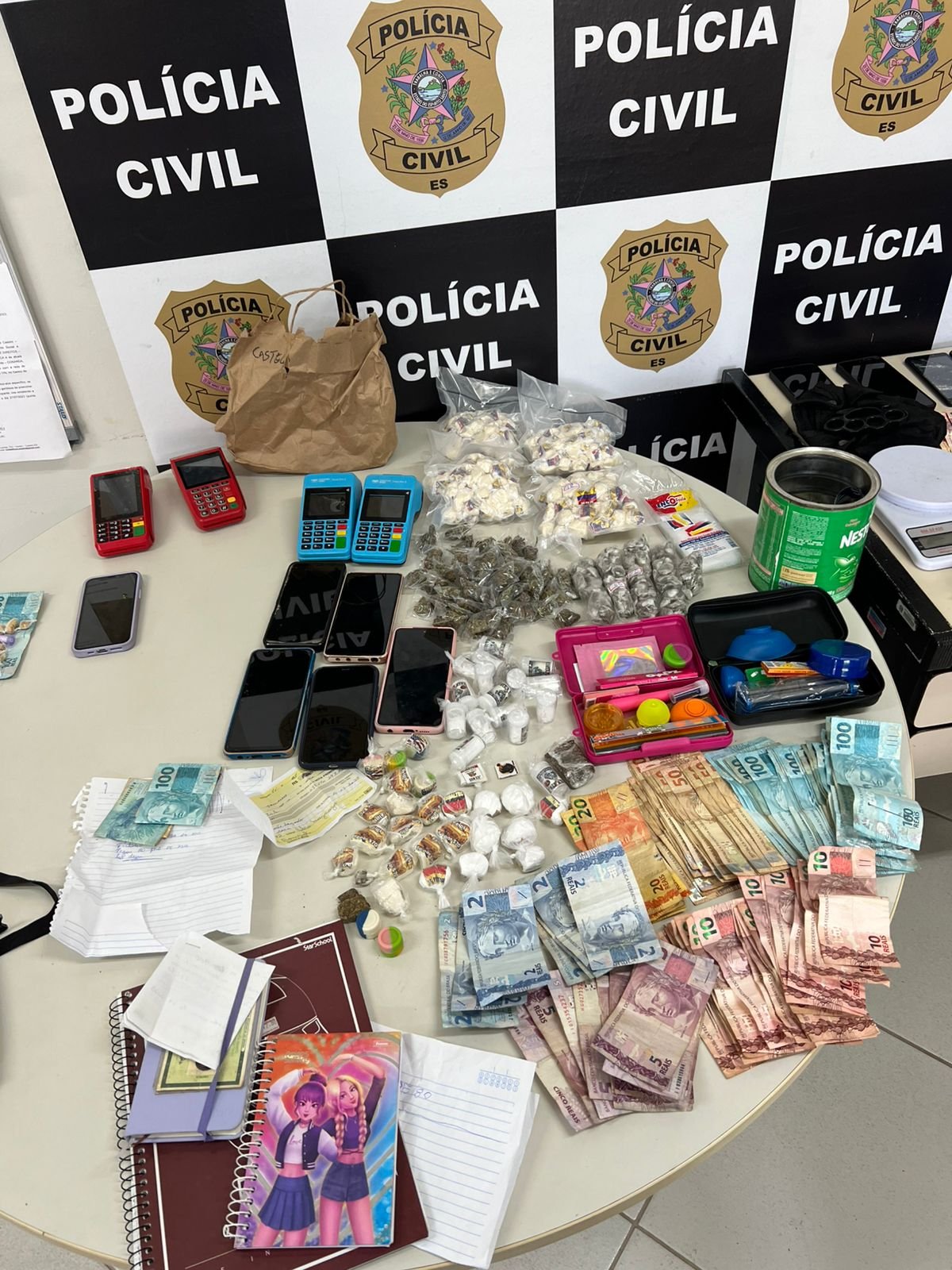 A Polícia Civil prendeu cinco suspeito de tráfico e apreendeu drogas em operação realizada em Castelo. Uma adolescente foi apreendida. A ação, desenvolvida na última sexta-feira (20) e divulgada nesta terça-feira, foi desenvolvida pela Delegacia de Polícia (DP) de Castelo, com apoio da Polícia Militar. O foco da operação foi o combate ao tráfico de drogas no bairro Aracuí, sendo cumpridos aí três mandados de busca e apreensão.