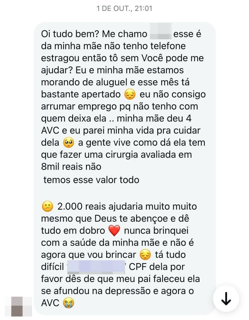 Durante a apuração, a equipe policial confirmou a existência da idosa e de sua filha, bem como o fato de que a mulher de 65 anos realmente apresenta um quadro de saúde debilitado. No entanto, foi constatado que a situação de extrema dificuldade financeira relatada nas mensagens não correspondia à realidade. De acordo com a investigação, a idosa possui outros filhos e recebe benefícios previdenciários que garantem uma renda mensal fixa.