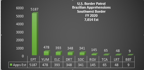 Em relação ao ano fiscal de 2020, em razão da pandemia do COVID-19, o número de apreensões de brasileiro diminui, totalizando 7.014 casos.