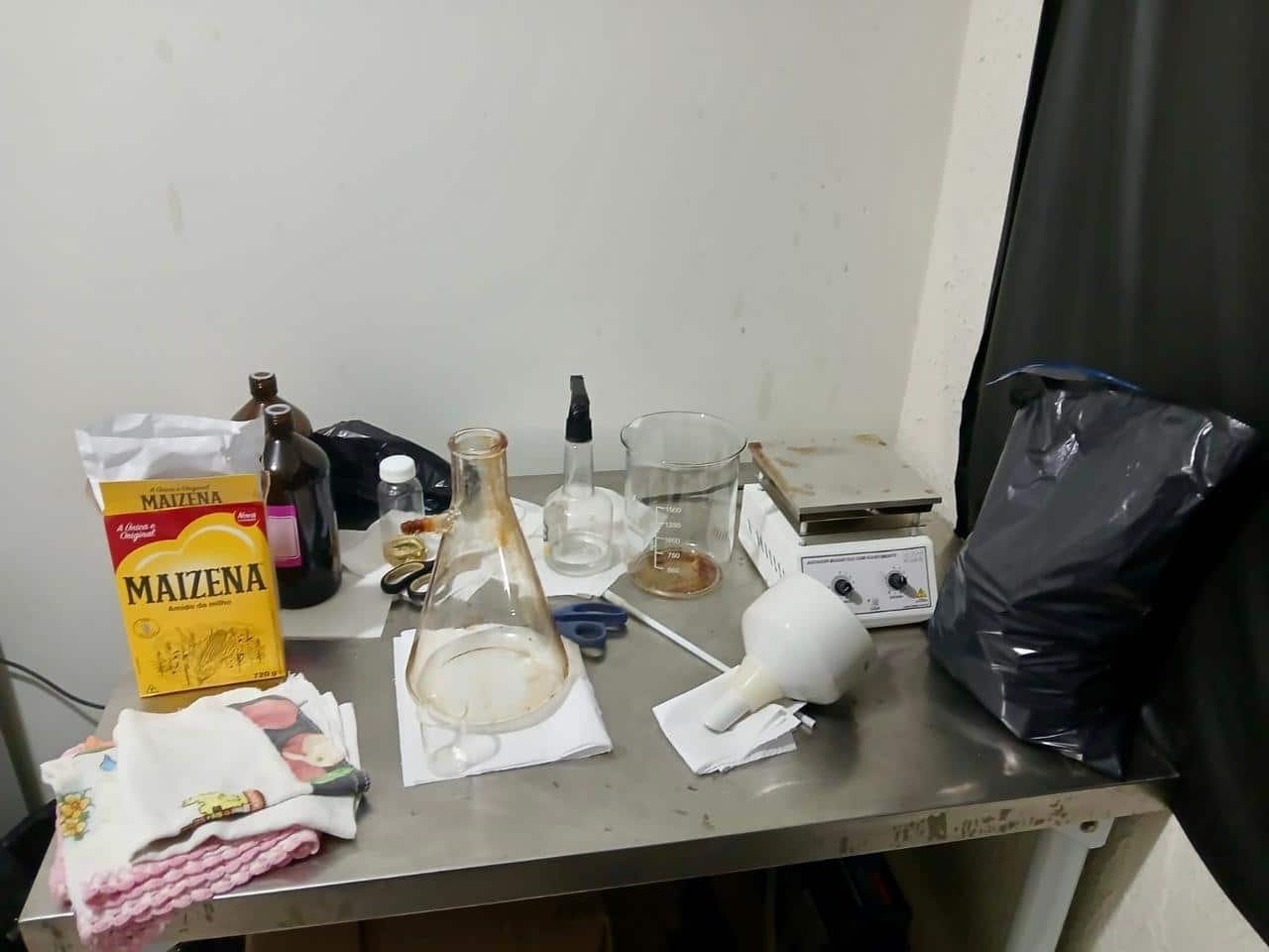 Apesar da resistência, a equipe conseguiu entrar na casa e constatou a existência de um laboratório clandestino de anabolizantes em pleno funcionamento. No local, foram encontrados diversos frascos já embalados, substâncias aparentemente anabolizantes, além de equipamentos utilizados na produção.