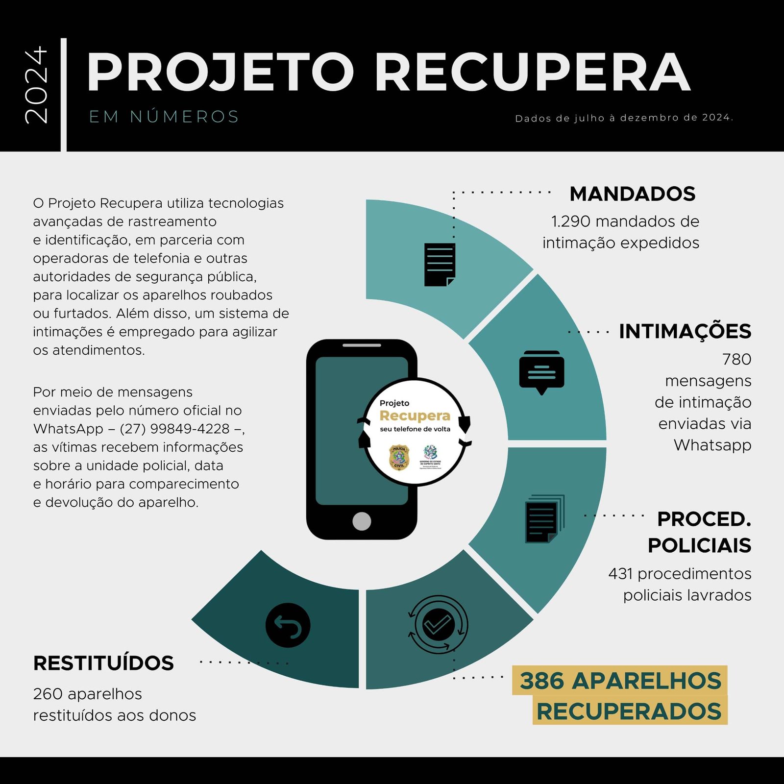 A Polícia Civil apresentou, nessa segunda-feira (3), o balanço das atividades do Projeto Recupera, revelando que, entre julho e dezembro de 2024, foram recuperados 386 aparelhos celulares roubados ou furtados no Espírito Santo. Desde o lançamento do projeto, em julho de 2023, foram realizadas sete fases, resultando na expedição de 1.290 mandados de intimação, 431 procedimentos policiais lavrados e na recuperação de 386 aparelhos celulares, dos quais 260 foram restituídos aos legítimos proprietários.