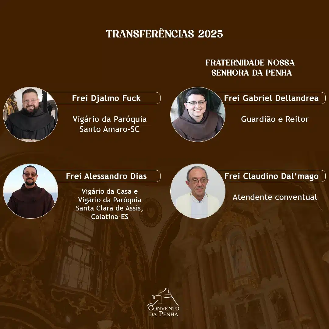 Além da mudança no nome do Guardião e Reitor do Convento, a Fraternidade Nossa Senhora da Penha contará com uma nova configuração de membros no próximo ano.