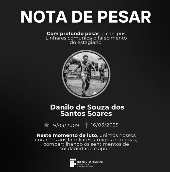O adolescente era estagiário da biblioteca do Instituto Federal do Espírito Santo (Ifes) de Linhares. Em nota, o Ifes lamentou a morte. “Neste momento de luto, unimos nossos corações aos familiares, amigos e colegas, compartilhando os sentimentos de solidariedade e apoio”, disse o comunicado.
