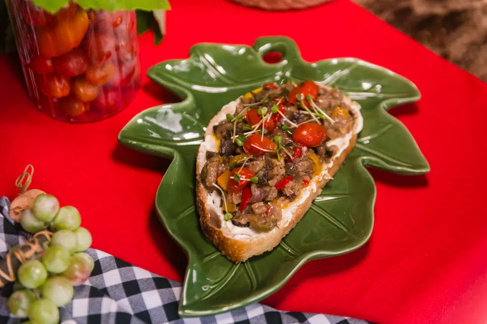 Prato 1: Toast de Antepasto de Berinjela: Fatia de pão rústico com nosso antepasto de berinjela e tomates confitados – R$24,00
