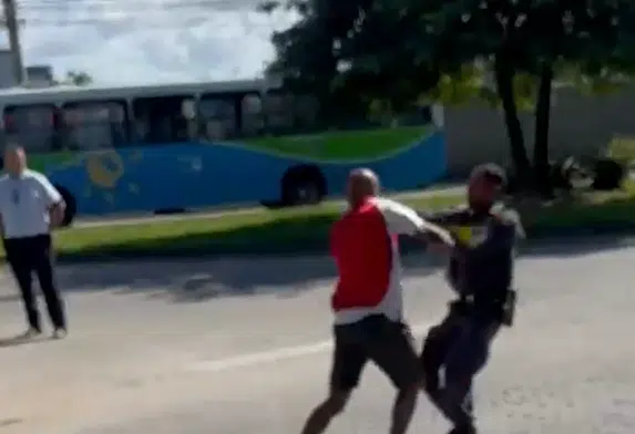 Enquanto a mulher era detida, o homem de 26 anos “começou a hostilizar os policiais e avançou fisicamente contra a equipe. Ele ainda tentou agredir os agentes com socos, pontapés e uma pedra”, completou a polícia.