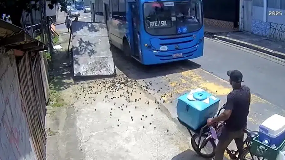 Nas imagens, é possível ver o momento em que o coletivo se aproxima do ponto, onde um passageiro fazia sinal para embarcar. O motorista acaba batendo na estrutura metálica da cobertura, que desaba logo em seguida. O homem que aguardava o ônibus escapa por poucos centímetros. Um ciclista que passava na via também precisou frear para evitar ser atingido.