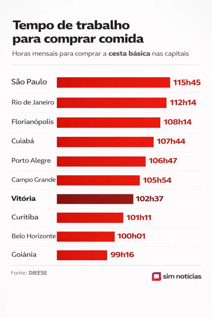 Em algumas cidades, a situação é ainda mais pressionada. São Paulo lidera o ranking, onde um trabalhador precisa dedicar 115 horas e 45 minutos para comprar a cesta básica.