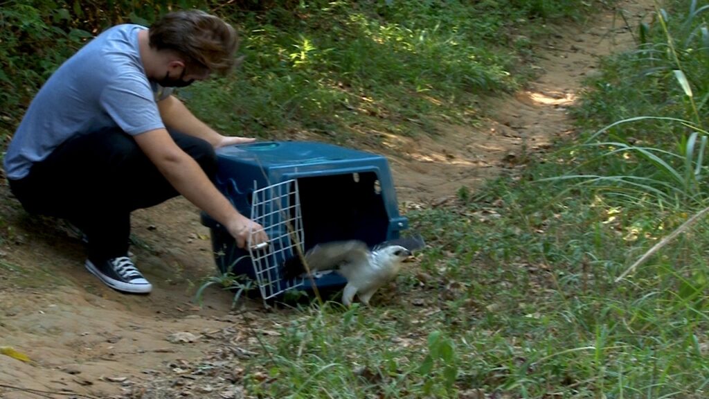No momento da soltura, quando a porta da caixa de transporte do animal foi aberta, ele voou rapidamente, determinado, demonstrando estar muito bem de volta para casa.